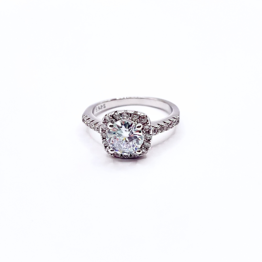 A stunning cushion cut cubic zirconia ring with CZ stone halo and band that's sure to make a statement. Made from silver and high quality cubic zirconia stones, this is one dress ring that definitely has the wow factor.